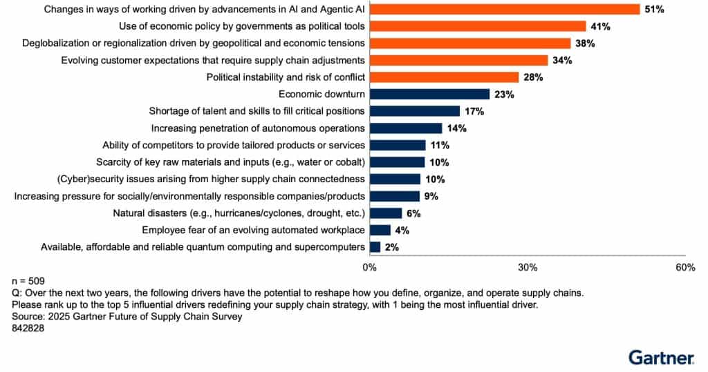 The report highlights that changes driven by AI advancements are anticipated to be the single most influential factor redefining supply chain strategies in the next two years. This shift underscores the essential need for human-machine collaboration in operations.