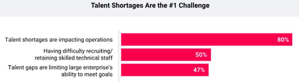 Fifty per cent of technology leaders report difficulty recruiting and retaining skilled staff, and 80% say talent shortages are already affecting operations, with large enterprises especially constrained in meeting business goals.