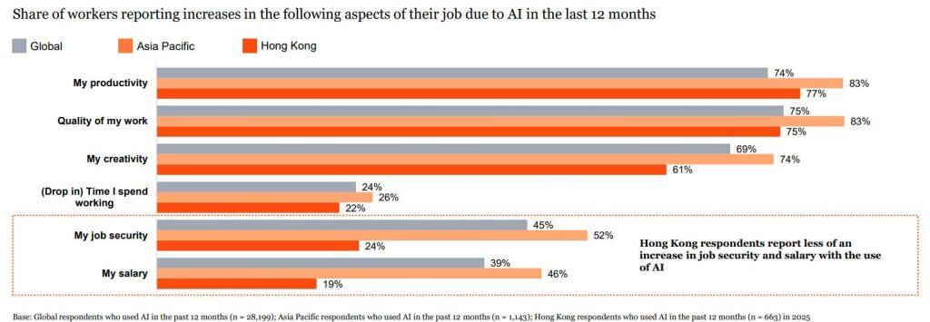 As digital transformation continues to reshape industries, AI has emerged as a critical element in business operations. The survey findings show that 77% of Hong Kong employees who use AI have experienced increased productivity, while 75% report enhanced work quality. However, despite these improvements, only 24% of respondents feel more secure in their jobs, and a mere 19% associate salary increases with AI.