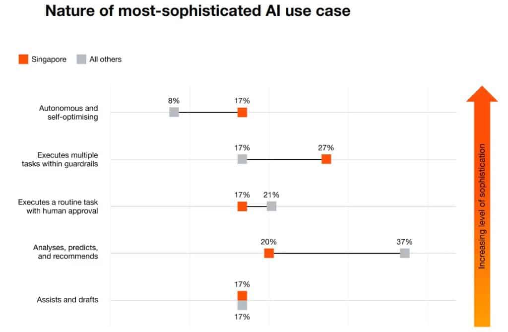 Singapore businesses are less likely than peers worldwide to deploy AI only for basic analytics, prediction and recommendations and more likely to use it in autonomous or self‑optimising modes, which PwC sees as a sign of higher‑order maturity.