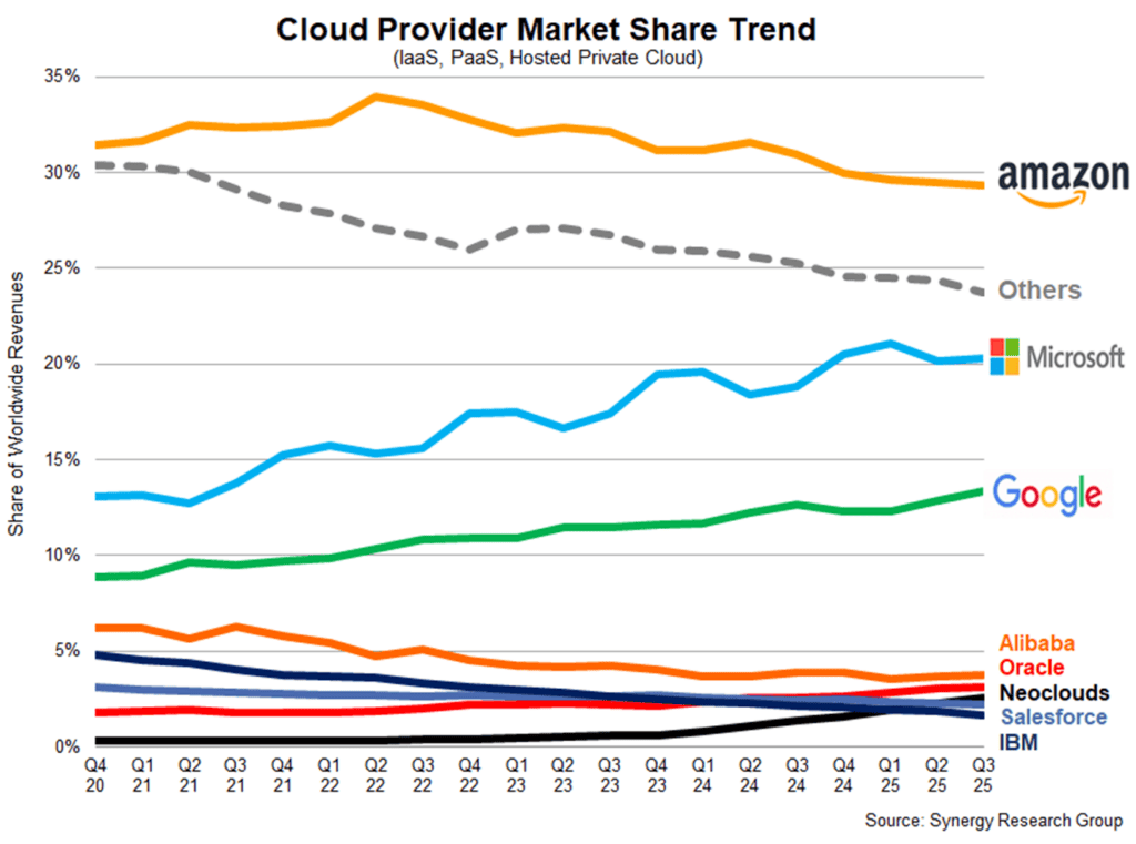 Recent data from Synergy Research Group highlights the continuing dominance of Amazon, Microsoft, and Google in the cloud infrastructure services sector, collectively accounting for 63% of enterprise spending in Q3 2025.